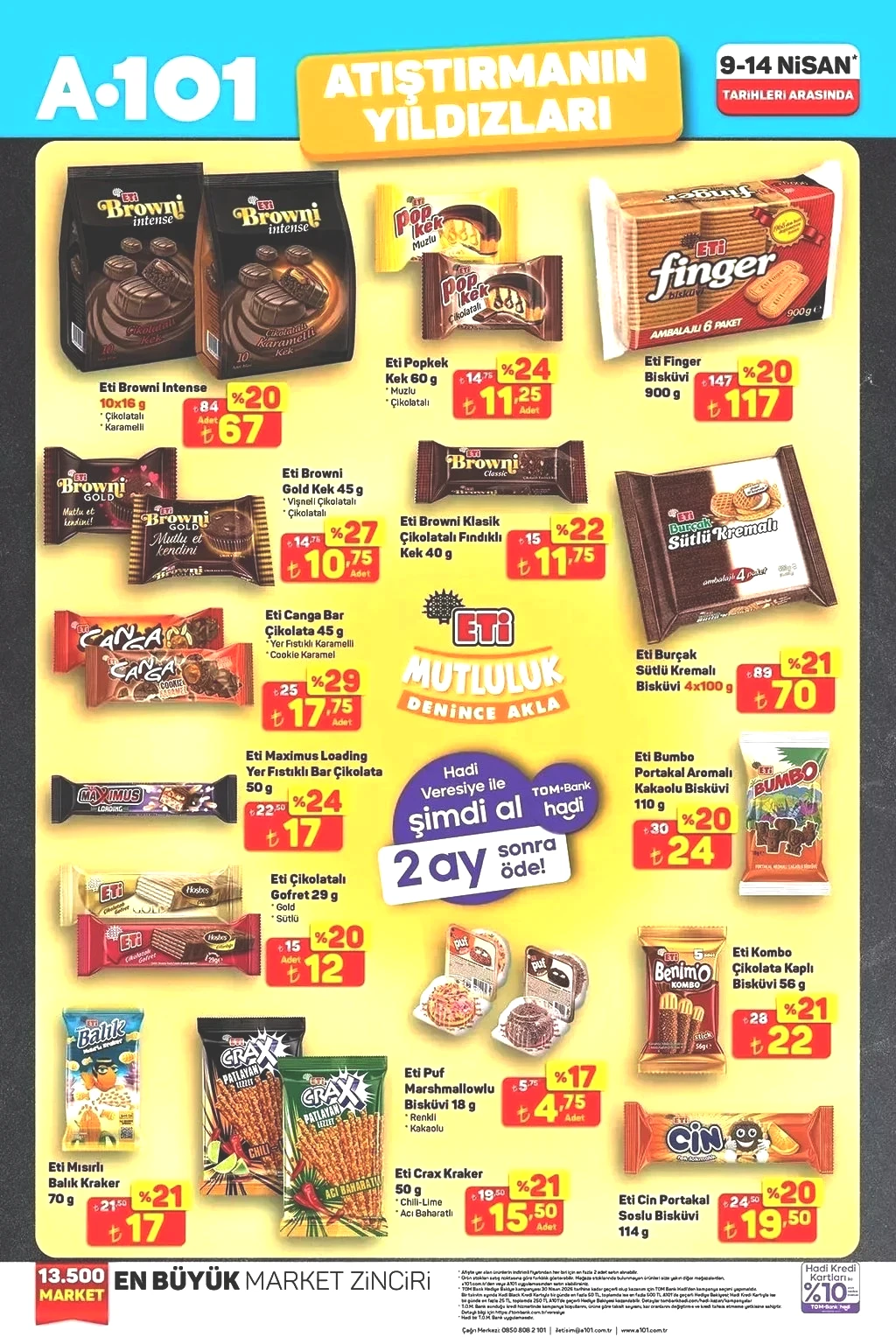11-17 Nisan tarihleri boyunca geçerli indirimli ürünler arasında Yudum ayçiçek yağı 4,5 litre 429,50 TL, toz şeker 5 kg 209,50 TL, Doğuş Rize çayı 1 kg 239 TL, buğday unu 5 kg 105 TL, Bingo 36’lı bulaşık makinesi kapsülü 159 TL olarak paylaşılmıştır. Atıştırmalık bölümünde ise fındıklı çikolata 125 TL, Antep fıstıklı çikolata 75 TL, Probis bisküvi 63 TL ve pötibör bisküvi 24 TL fiyatlarla listelenmiştir.