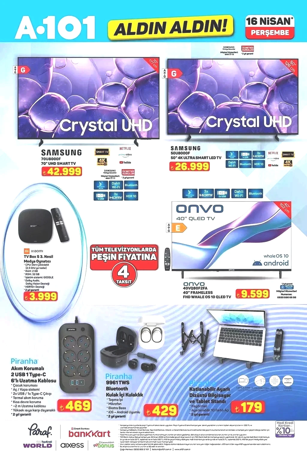 16 Nisan Perşembe günü raflarda buluşacak ürünler arasında Samsung 70 inç UHD Smart TV 42.999 TL, Samsung 50 inç 4K Ultra Smart LED TV 26.999 TL, 40 inç Frameless FHD Whale OS 10 QLED TV 9.599 TL ve TV Box S 3. Nesil Medya Oynatıcı 3.999 TL fiyatıyla satışa sunulacak. Teknoloji kategorisinde katlanabilir dizüstü bilgisayar ve tablet standı 179 TL, bluetooth kulak içi kulaklık ise 429 TL olarak listeye alındı. Akım korumalı uzatma kablosu ise 469 TL olarak kaydedildi.
