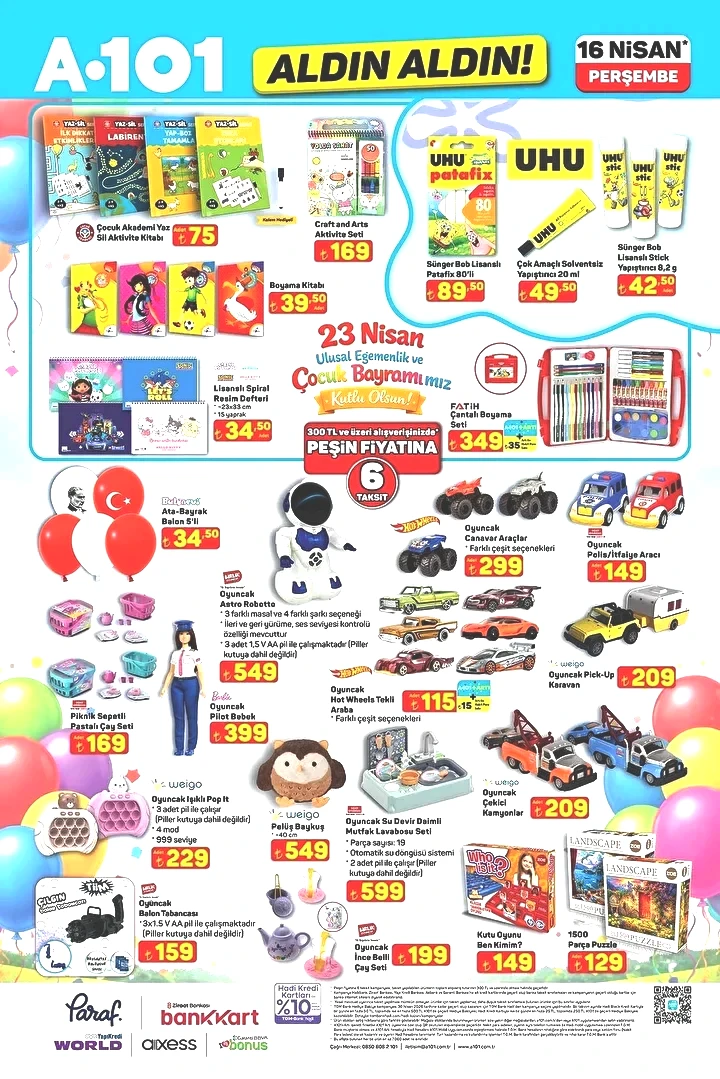 23 Nisan öncesi oyuncaklar ve çocuk ürünleri de katalogda geniş bir yer tutmuş. Kumandalı akülü araba 11.999 TL, akıllı dron 1.799 TL, ışıklı paten 799 TL, çocuk scooter'ı 799 TL ve çeşitli eğitici oyuncaklar satışa sunulacak.