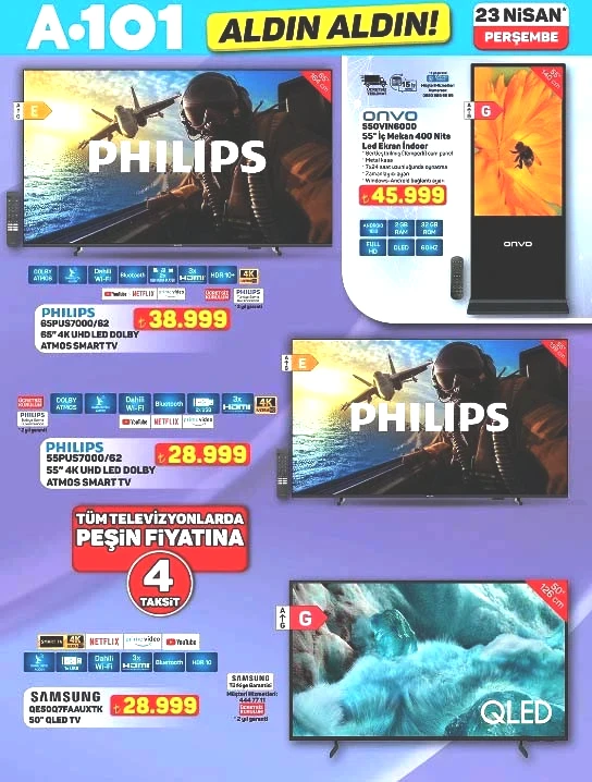 65″ 4K UHD LED Dolby ATMOS Smart TV 38.999 TL, 55″ İç Mekan 400 Nits LED Ekran 45.999 TL, 55″ 4K UHD LED Dolby ATMOS smart TV 28.999 TL, 50″ QLED TV 28.999 TL, M26 Cep Telefonu 5.999 TL, JBL Kablosuz Kulaküstü Kulaklık 1.899 TL, Bluetooth Kablosuz Çocuk Kulaklık 499 TL, Extender Pro Wi-Fi Güçlendirici 799 TL, BT Kulaklık 449 TL, LED Ampul 6 W 99,50 TL, Gizli Damacana ve 3 Musluklu Su Sebili 8.499 TL, Beyaz Turbo Cam Ankastre Set 9.999 TL, No-Frost Buzdolabı 23.999 TL, 7 KG Çamaşır Makinesi 14.799 TL.