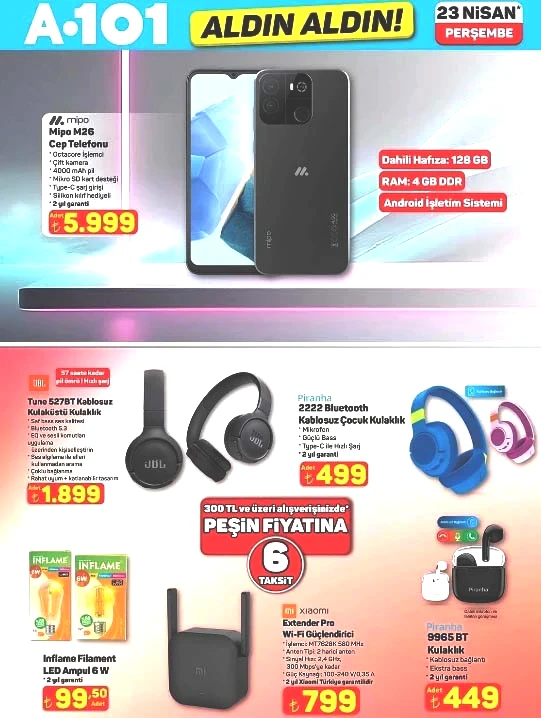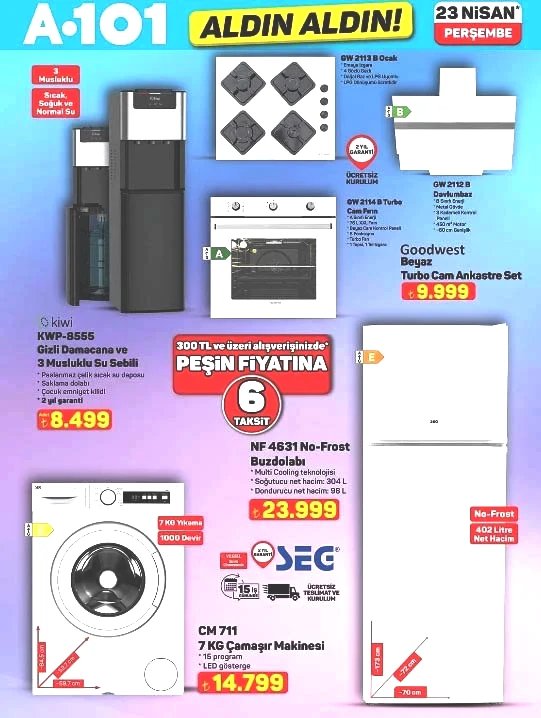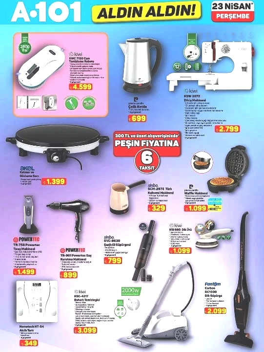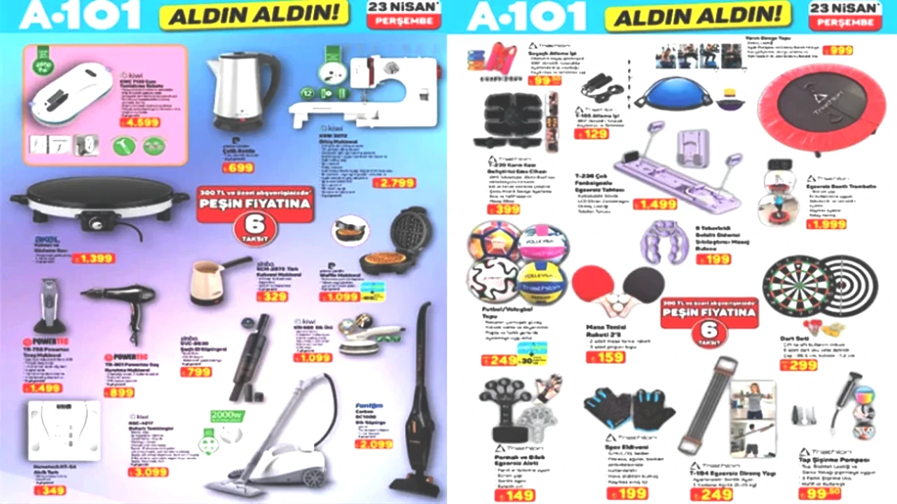 A101 bu hafta yeni katalogunu ve Haftanın Yıldızları broşürünü yayımladı. A101 Aldın Aldın kampanyası çerçevesinde indirimli ürünler 23 Nisan 2026 Perşembe günü raflarda yer alacak. Bu haftaki broşürde dikkat çeken ürünler arasında su sebili, cam temizleme robotu, karın kası geliştiren EMS cihazı, trambolin ve duvar aydınlatma ürünleri bulunuyor. A101’de Perşembe günü satışa sunulacak ürünler arasında gizli damacana ve 3 musluklu su sebili 8.499 TL, cam temizleme robotu 4.599 TL, Magly her yaştan bireye hitap eden manyetik blok seti 36 parça 899 TL, 55 inç iç mekan LED ekranı 400 nits 45.999 TL fiyatla, 65 inç 4K UHS LED Dolby Atmos akıllı televizyon 38.999 TL, 50 inç QLED TV 28.999 TL, kablosuz kulaküstü kulaklık 1.899 TL, wi-fi güçlendirici 799 TL, beyaz turbo cam ankastre set 9.999 TL, dikiş makinesi 2.799 TL, waffle makinesi 1.099 TL, dik ütü 1.099 TL, katmer ve gözleme pişirme seti 1.399 TL, buharlı temizleyici 3.099 TL, şarjlı el süpürgesi 799 TL, VTS PRO üç tekerlekli moped 89.990 TL, 15 jant bisiklet 2.999 TL, 10 parça kahvaltı takımı 699 TL, desenli opal tabak 59,50 TL yer alıyor.