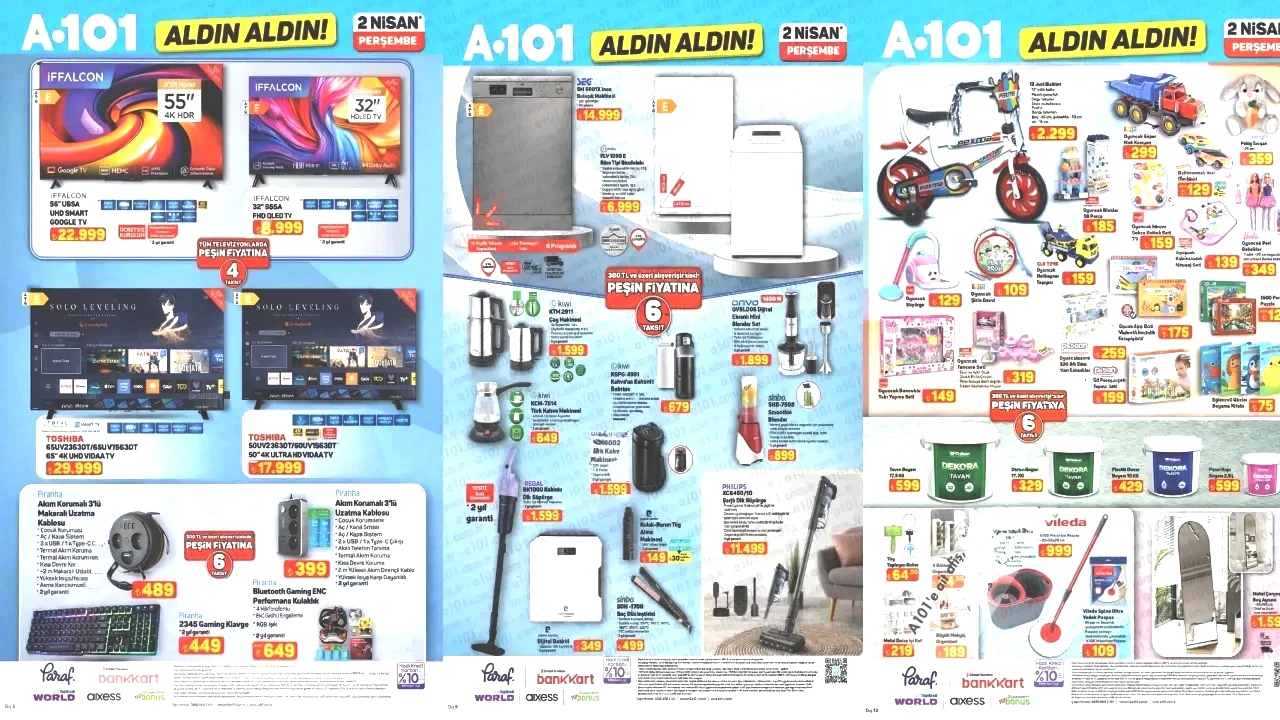 A101, 23 Nisan 2026 Perşembe günü mağazalarda yer alacak olan güncel ürün kataloğunu açıkladı. Bu katalogda evini yenilemek isteyenler için geniş bir televizyon yelpazesi, beyaz eşyalar ve çeşitli mutfak ürünleri öne çıkıyor. Öngörülen kampanya çerçevesinde 65 inç 4K UHD Smart TV, 55 inç 4K UHD Smart TV ve 50 inç QLED TV gibi birçok model raflarda bulunacak. Motorlu taşıt ürünleri arasında ise benzinli motosiklet ve moped seçenekleri yer almakta. Ayrıca mutfak düzenini sağlamak amacıyla turbo cam ankastre set 9.999 TL fiyatıyla satışa sunulacak. 23 Nisan Ulusal Egemenlik ve Çocuk Bayramı etkinlikleri kapsamında oyuncak, bisiklet ve spor ekipmanları da mağaza raflarını süsleyecek. Satışların sınırlı stoku olacağı ve fiyatların mağaza ile tedarik durumuna bağlı olarak değişiklik göstereceği hatırlatılıyor.