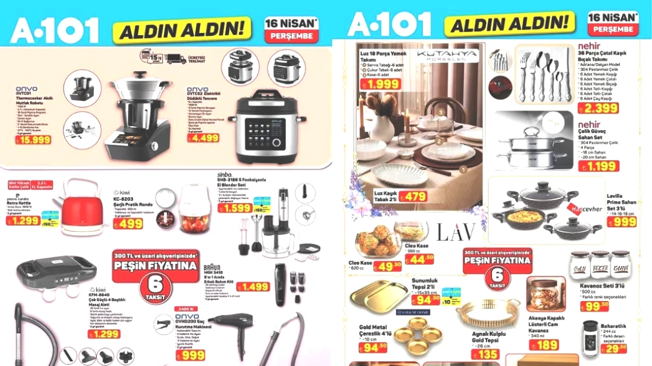 A-101, 16 Nisan 2026 Perşembe günü itibarıyla geçerli olacak yeni ürün kataloğunu tanıttı. Öne çıkan ürünlerden biri olan Onvo marka akıllı düdüklü tencere 4.499 TL’ye satılıyor. Ayrıca, Paşabahçe’nin 18 parça bardak takımı ve borcam setleri de bu kampanyada yer almakta. A-101, 300 TL ve üzeri alışverişlerde peşin fiyatına 6 taksit fırsatı sunarak, televizyon, elektrikli bisiklet, beyaz eşyalar, kamp malzemeleri ve çocuk ürünlerinde de indirimler sağlıyor. İşte katalogda yer alan tüm ürünler.