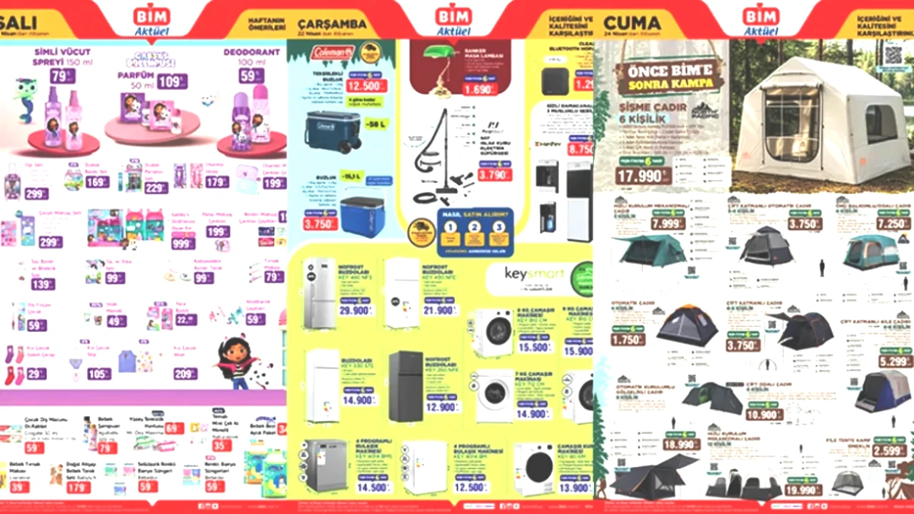 Bim'in 21-22-24 Nisan 2026 tarihli aktüel kataloğu, önümüzdeki hafta yeni ürünlere ev sahipliği yapacağını duyurdu. Haftanın heyecanla beklenen Bim afişi, alışveriş meraklılarının bu Cuma raflarda yer alacak ürünlere dair araştırmalarını artırdı. Bim'de, bu hafta getirilecek ürünler netleşti. Cuma günü, Bim online ve mağazalarında çadır malzemeleri geniş bir ürün yelpazesiyle indirimli fiyatlarla müşterilerin beğenisine sunulacak. Ayrıca, Bim’in sunduğu bu ürünler, Bim online alışveriş platformundan da temin edilecek. 24 Nisan 2026 tarihinde satışa çıkacak aktüel ürünler arasında; North Pacific marka Yan Masalı ve Termos Çantalı Kamp Sandalyesi 2.990 TL, Portatif Kamp Sandalyesi 699 TL, iki kişilik Şişme Yatak 4.750 TL, tek kişilik Şişme Yatak 1.990 TL, Ahşap Kollu Kamp Sandalyesi 1.229 TL, Şişme Yastık 129 TL, North Pacific Direkli Kamp Gölgeliği 6.790 TL, Katlanabilir Kampet ise 2.999 TL fiyatıyla raflarda yer alacak.