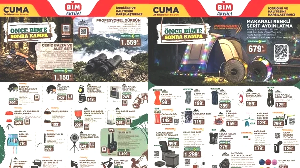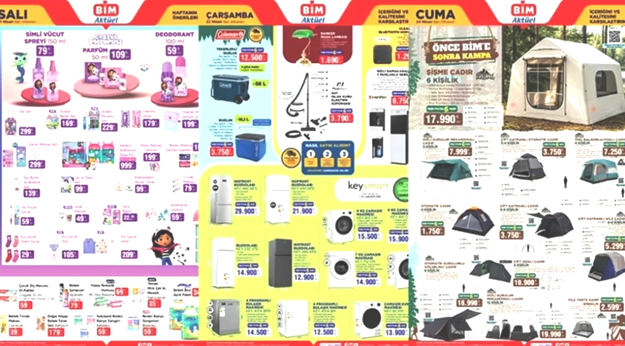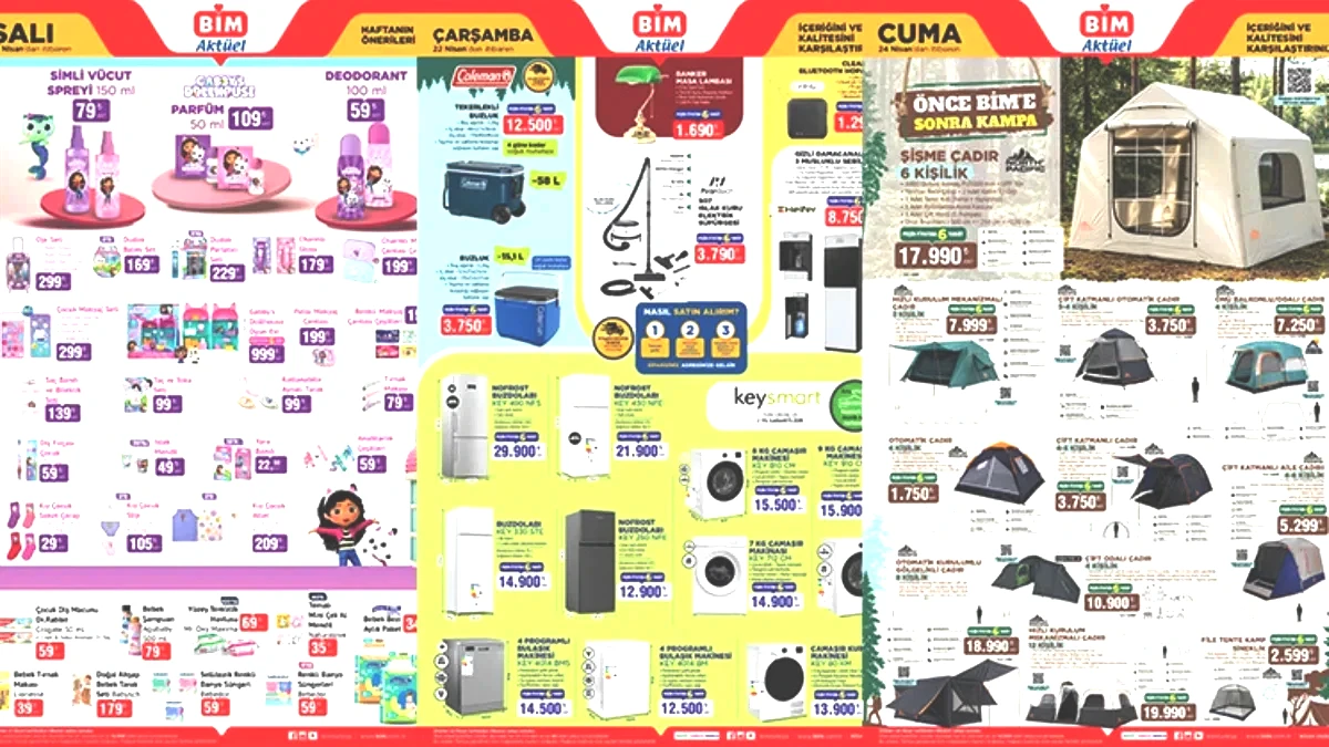 BİM, 21-22 ve 24 Nisan 2026 tarihlerini kapsayan yeni aktüel ürün kataloğunu yayınladı. Kataloğu inceleyerek kamp ekipmanları, teknolojik cihazlar, mutfak eşyaları ve gıda ürünleri gibi birçok farklı ürünü keşfedin. Özellikle kamp malzemeleri ve elektronik ürünler, dikkat çeken seçenekler arasında.