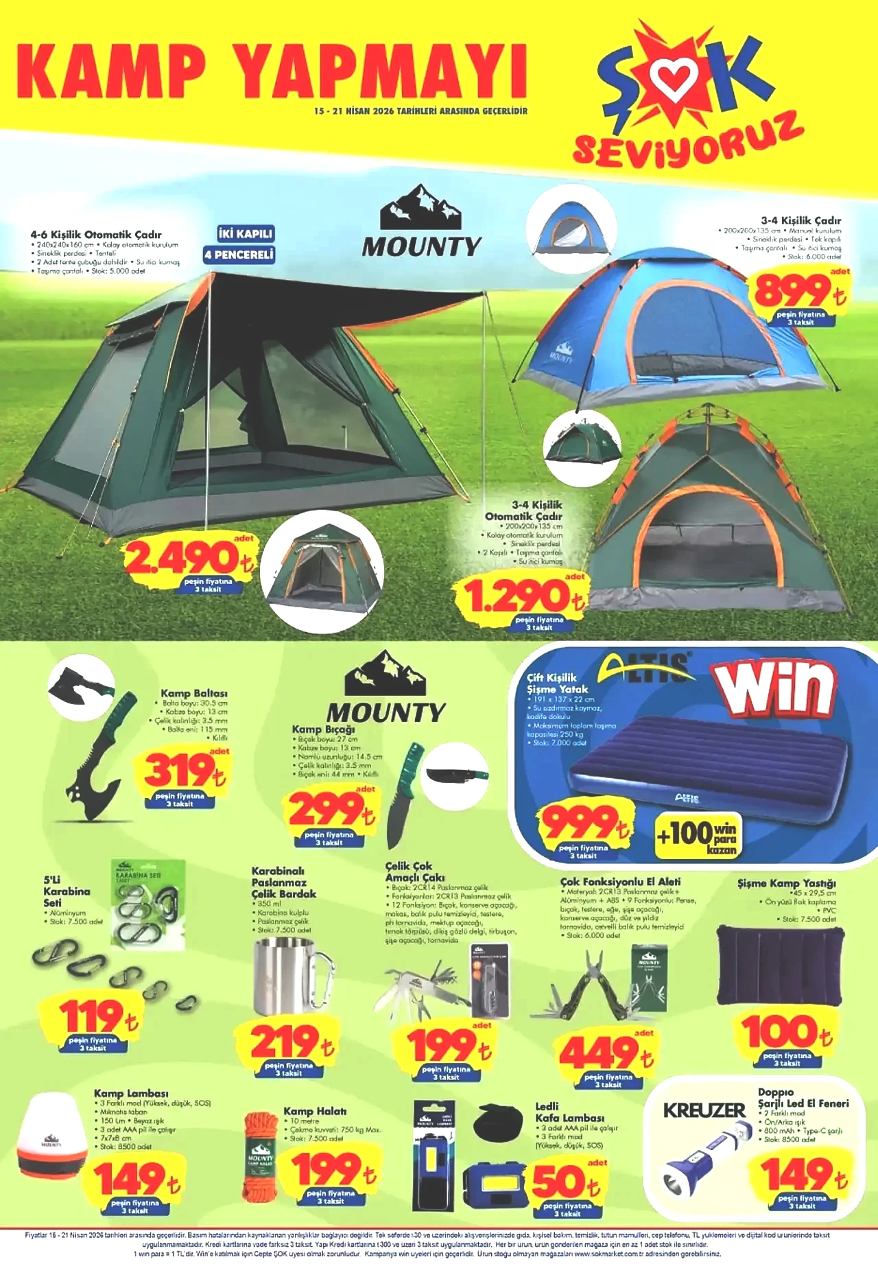 ŞOK’un 15 Nisan kataloğu yalnızca teknoloji ile sınırlı kalmıyor, baharın gelişini de kutluyor. Dış mekan tutkunları için Mounty otomatik çadırlar, XL kamp sandalyeleri ve kamp tabureleri beğeniye sunuluyor. Piknik keyfini artırmak için Akel Şişli Ocakbaşı kapaklı ızgara, Buzzy 20 litre termos ve çeşitli termal çantalar, açık hava aktivitelerini daha konforlu hale getirmeyi amaçlıyor.